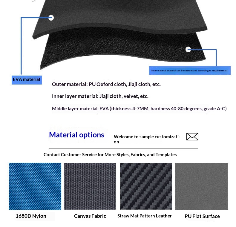 Middle material: EVA (thickness 4-7MM, softness 40-80 degrees, grade A-C)